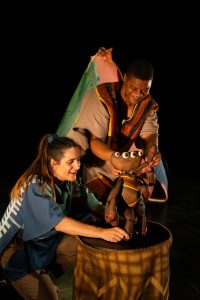 Met een ingenieus decor en sprankelende muziek word je het verhaal ingezogen. Het decor verandert van olifant naar walvis en van uitgestrekt woud naar het huis van Anansi, waar hij op sluwe wijze een bananenimperium probeert te beginnen. Maar of dat hem lukt…?